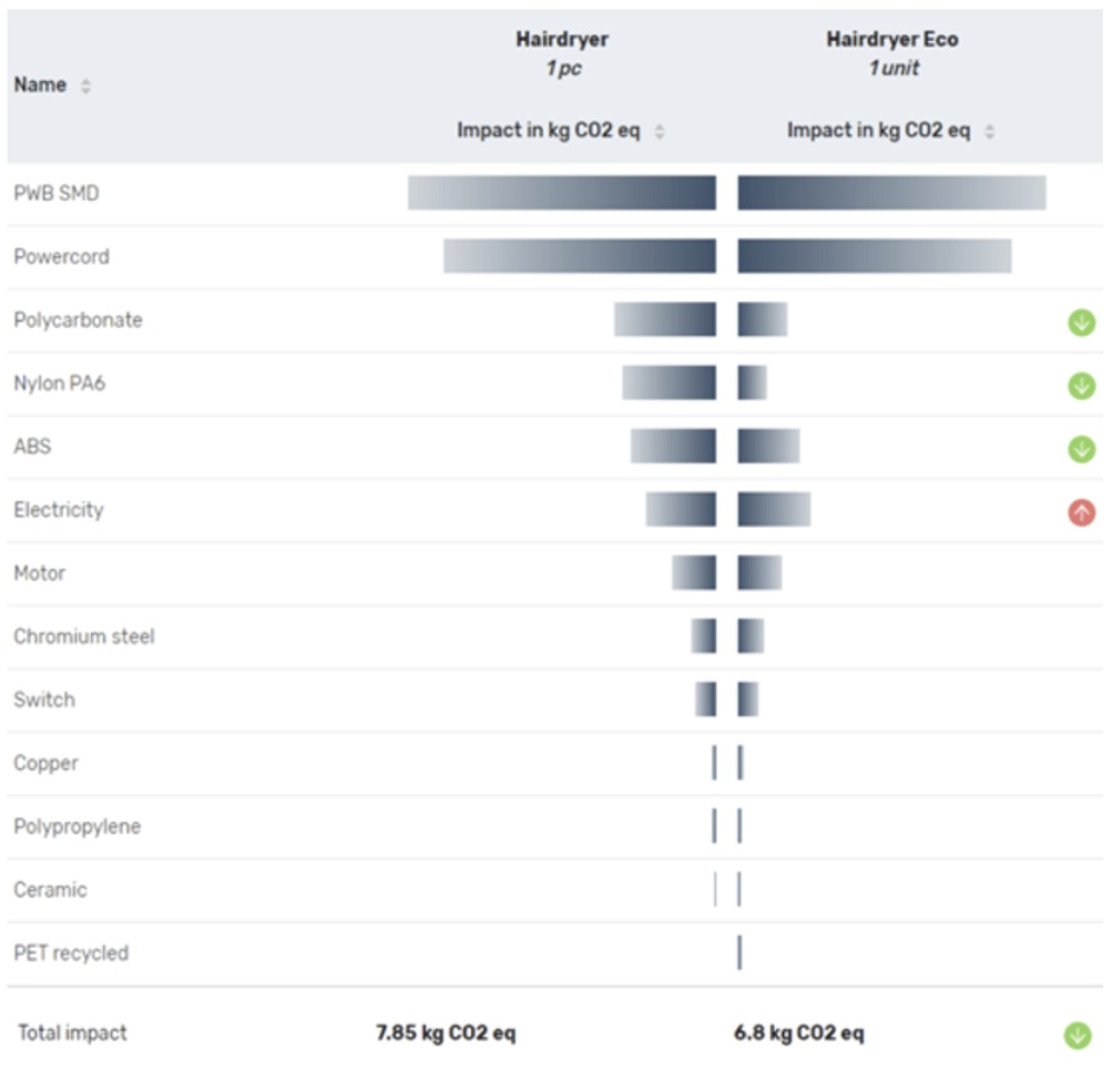 Image 1. Impact comparison between a Normal Hairdryer vs. Hairdryer Eco. The latter uses recycled content in the plastics of the housing, leading to a reduction of more than 1 kg CO2-eq.