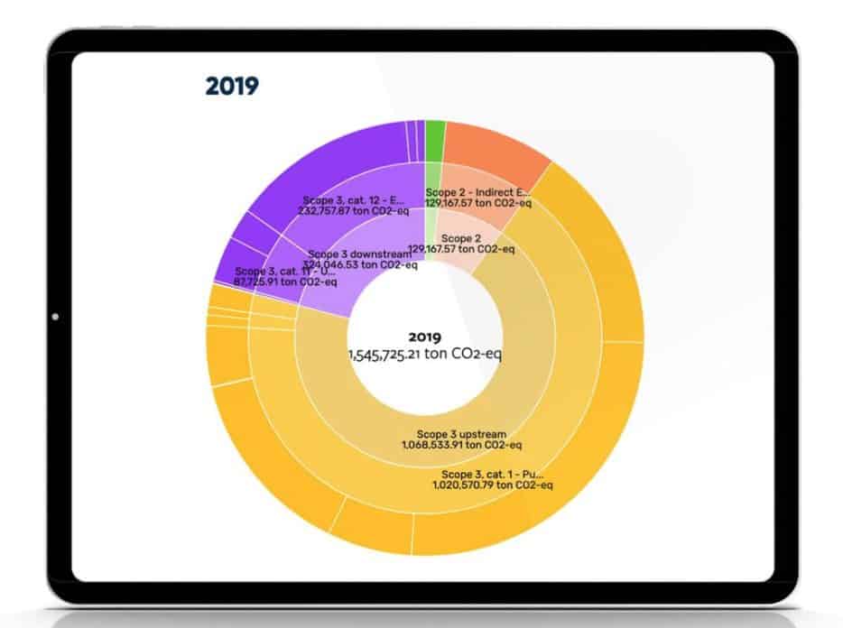 Image 1. A manufacturer’s company impact results expressed in CO2-eq results. The largest impact hotspot here is the supply chain (scope 3 emissions).