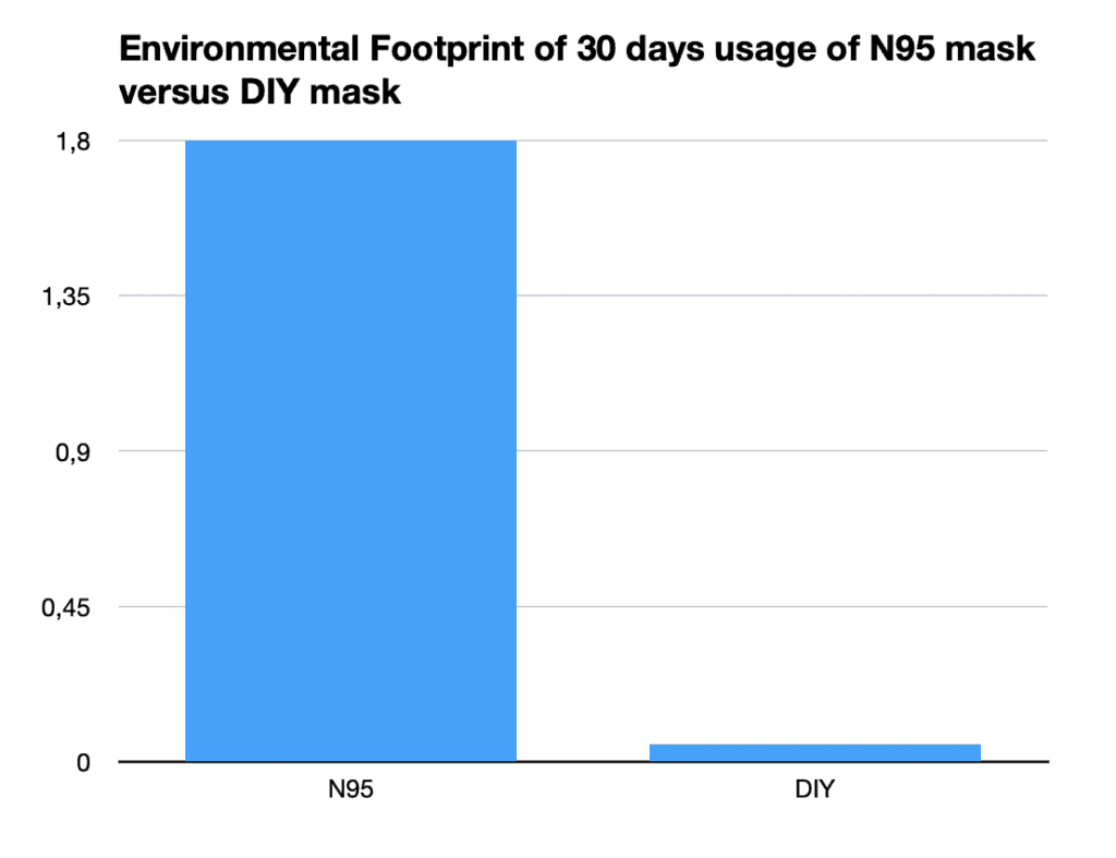 The result: 0,06 kg CO2-equivalent per face mask! The CO2 footprint of the cotton face mask is actually 20% higher than the footprint of the N95 protective face mask.