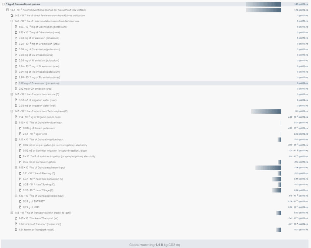 This is how the results look like. The total impact of 1kg of Quinoa is, in this case, 1,48kg of CO₂. The impact comes, exclusively, from man-made resources, with the biggest driver being the machinery used to produce the product.