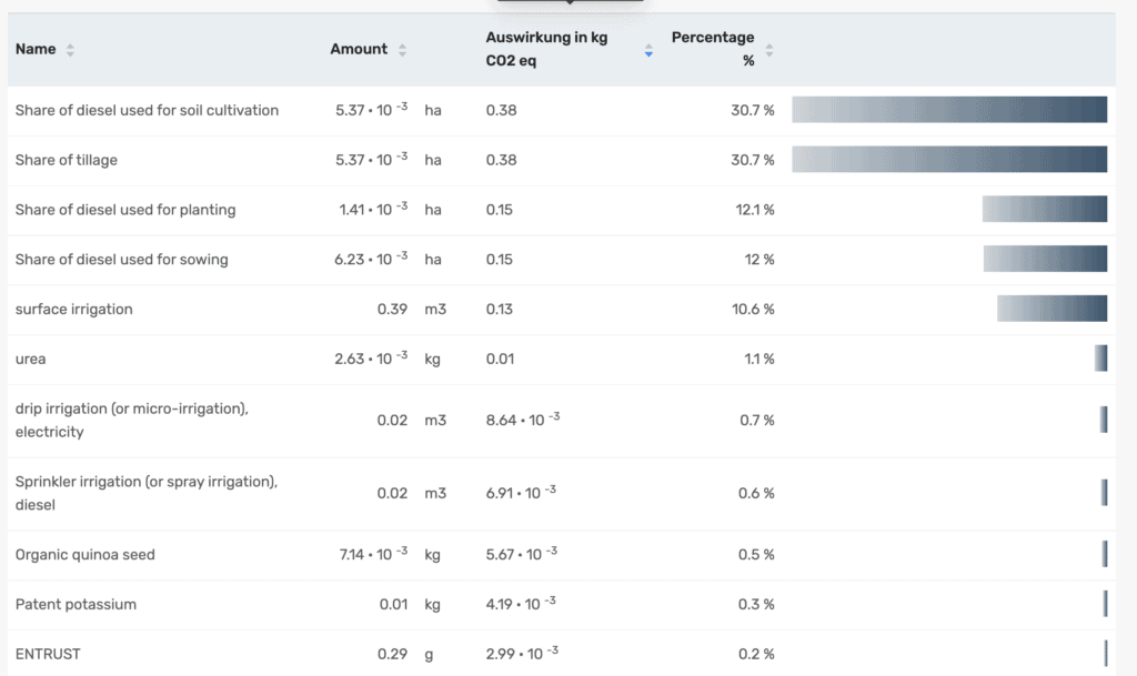 The data from Kellogg’s also came with quantities that we can use to calculate the impact of 1 kg of Quinoa.