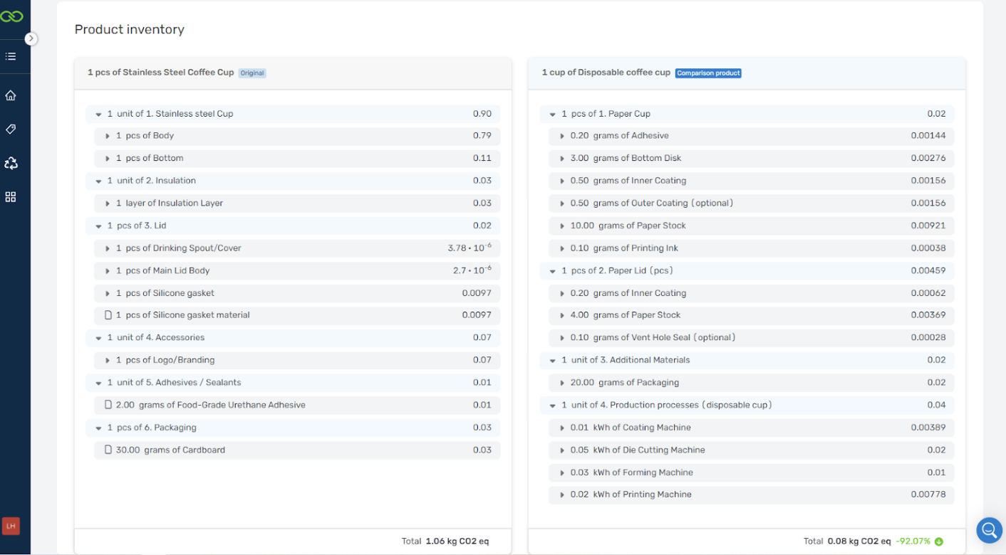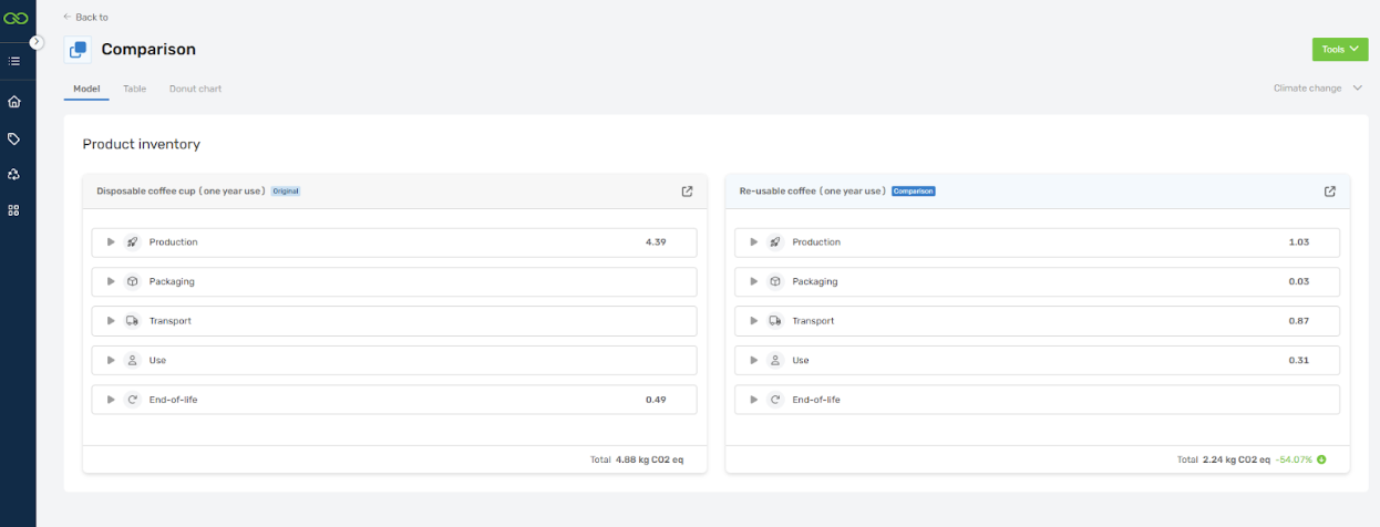 Once you have gathered your product data, you enter it into your product footprinting software to get a model of its impact. We have used Ecochain Mobius to model the product’s impact and generate our comparison.