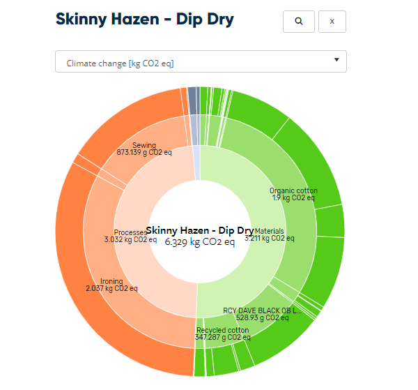 When zooming in on one pair of jeans, the “Skinny Hazen – Dip Dry” style of jeans showed a clear hotspot of environmental impact. (images below)