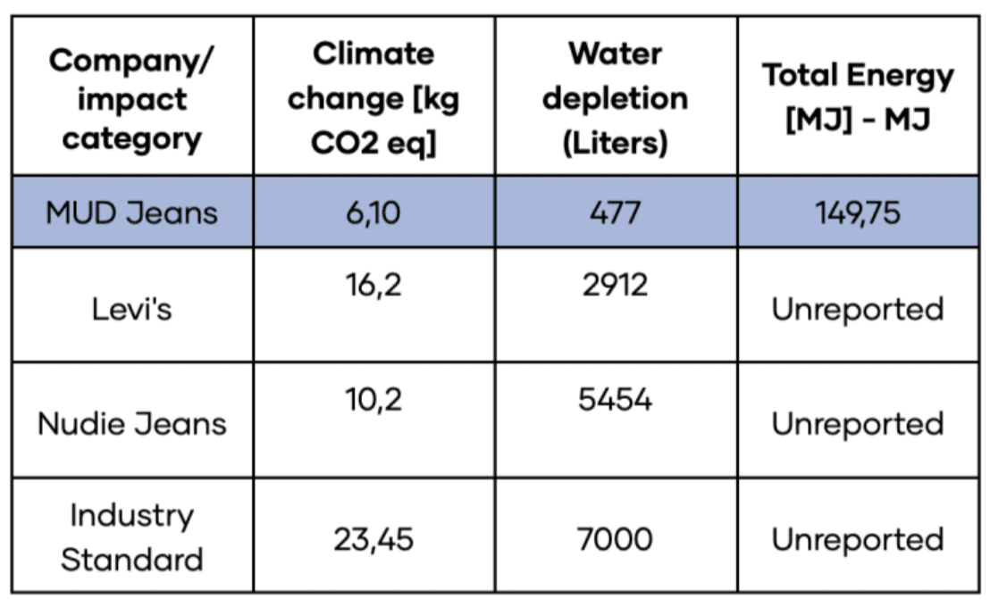 The analysis paid off. By measuring their impact, MUD Jeans can now compare their products to the industry standard. And they’re doing pretty well.